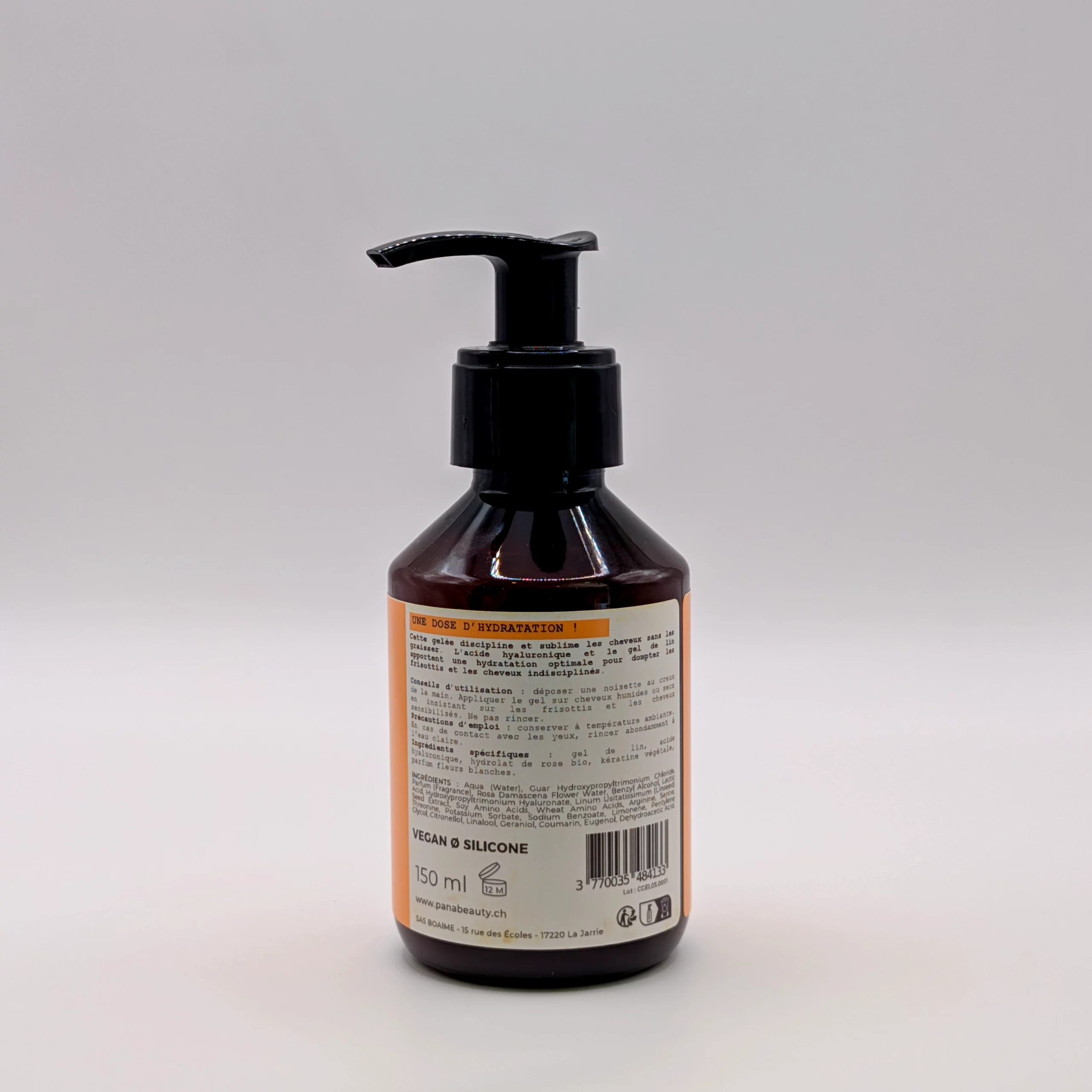 Gel de lin, acide hyaluronique, hydrolat de rose bio, kératine végétale, parfum fleurs