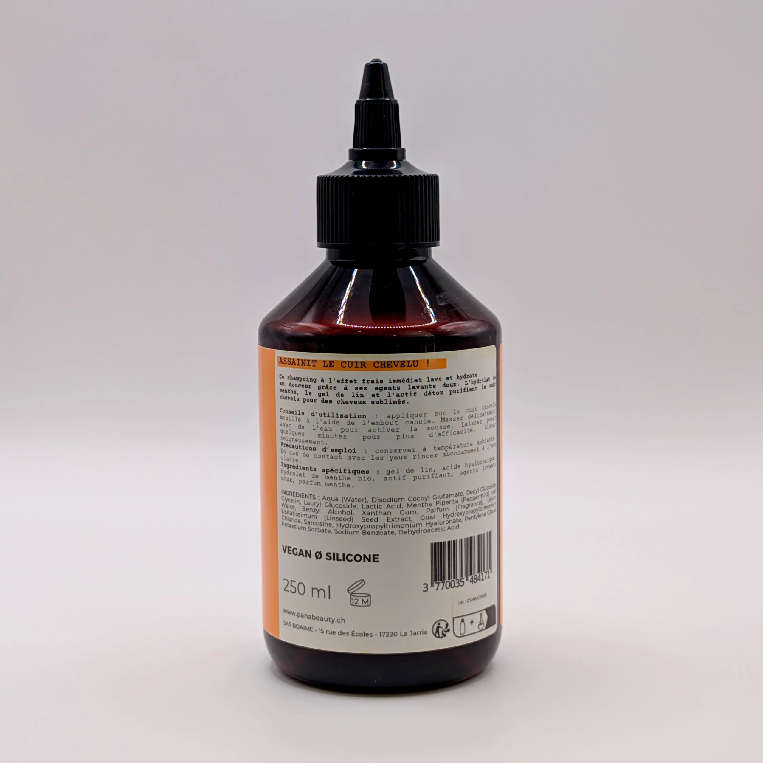 Le Shampoing Détox Pana Beauty nettoie et purifie le cuir chevelu tout en apportant une sensation de fraîcheur immédiate. Enrichi en hydrolat de menthe bio, actif purifiant et gel de lin, il hydrate et assainit les cheveux normaux à gras sans agresser.